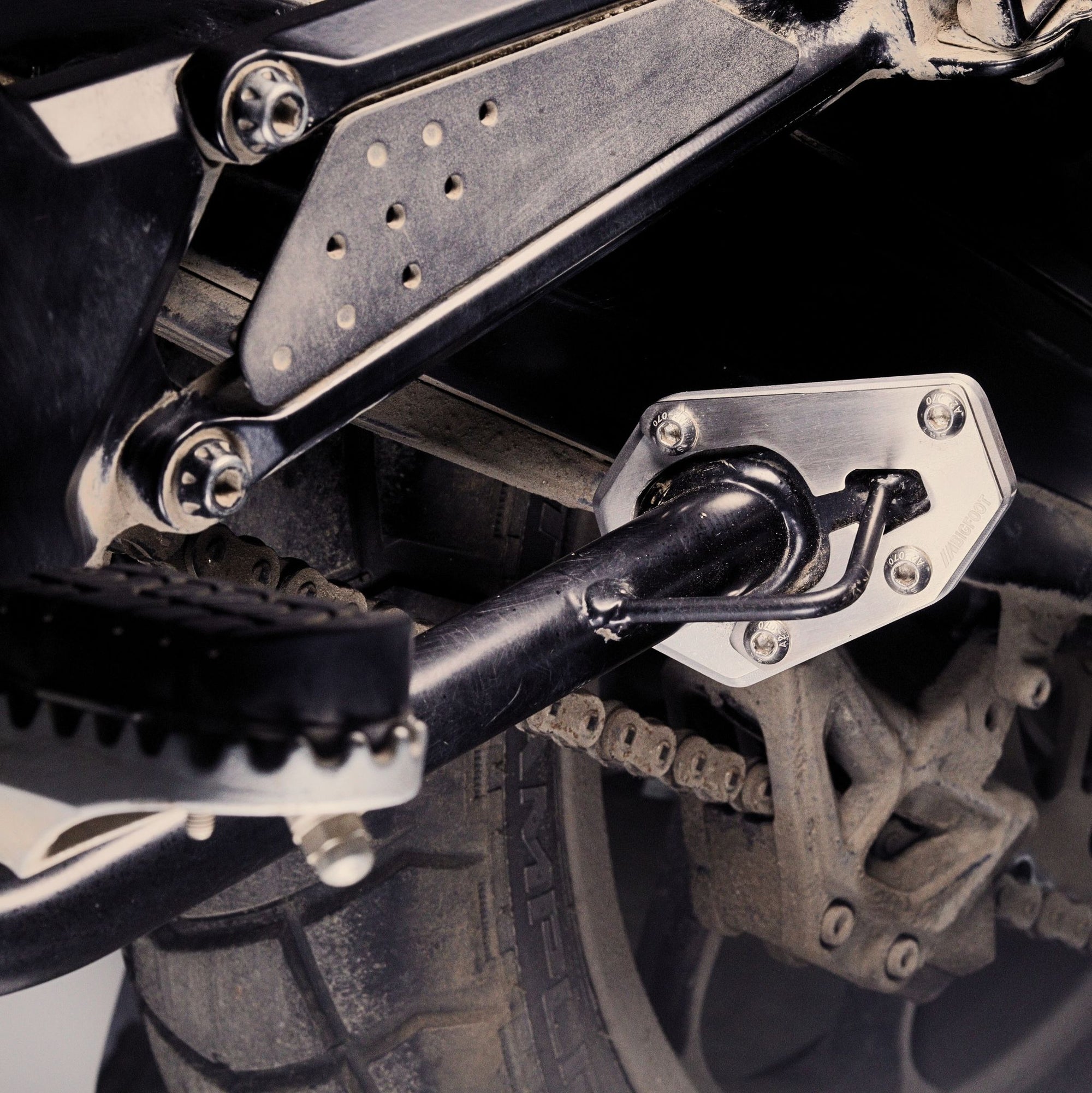 BIGFOOT™ ( side stand enlarger) extends the side stand’s base surface to almost double its original size, ensuring maximum stability even when your bike is fully loaded. No more worrying about your bike slowly slipping on wet roads, soggy trails, or uneven parking spots. The added leverage also makes it easier to climb onto, keeping your loaded motorcycle standing on kick stand.